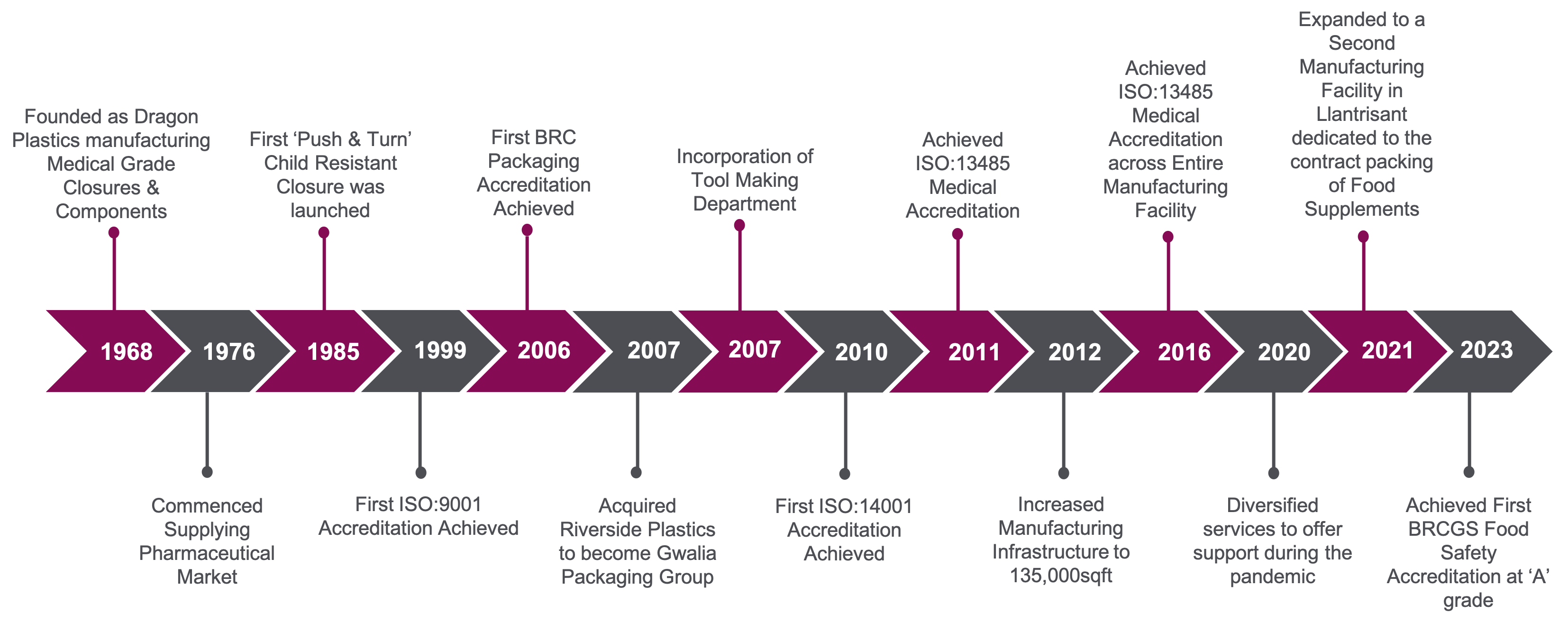 Gwalia enjoys a number of accreditations and these include: ISO 13485 for the entire facility (Issued by TUV) and BRCGS global standard for Packaging Materials and Food Safety.